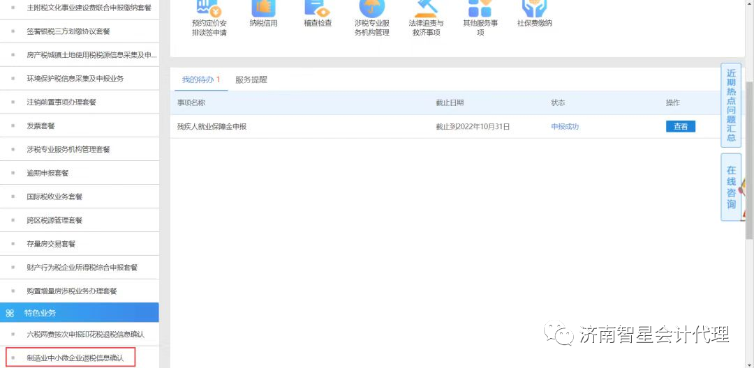 登錄山東省電子稅務(wù)局,通過(guò)“首頁(yè)---特色業(yè)務(wù)---制造業(yè)中小微企業(yè)退稅信息確認(rèn)”功能模塊操作,如下圖: