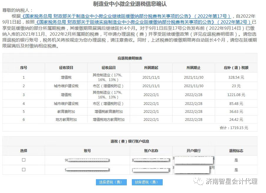 根據(jù)《國(guó)家稅務(wù)總局 財(cái)政部關(guān)于制造業(yè)中小微企業(yè)繼續(xù)延緩繳納部分稅費(fèi)有關(guān)事項(xiàng)的公告》(2022年第17號(hào)),自2022年9月1日起,按照《國(guó)家稅務(wù)總局 財(cái)政部關(guān)于延續(xù)實(shí)施制造業(yè)中小微企業(yè)延緩繳納部分稅費(fèi)有關(guān)事項(xiàng)的公告》(2022年第2號(hào))已享受延緩繳納的部分所屬期稅費(fèi),其緩繳期限屆滿(mǎn)后繼續(xù)延長(zhǎng)4個(gè)月。對(duì)于9月1日后至17號(hào)公告發(fā)布前(2022年9月14日)已繳納入庫(kù)的2021年11月、2022年2月所屬期的稅費(fèi),納稅人可自愿申請(qǐng)辦理退稅(費(fèi))并享受延續(xù)緩繳政策。